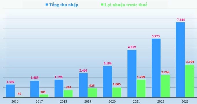 Kết thúc năm 2023, tổng thu nhập hoạt động của Nam A Bank ghi nhận 7.644 tỷ đồng, tăng 28% YoY (+1.671 tỷ đồng). Thế nhưng các chi phi hoạt động chỉ tăng 22,9% YoY (+651 tỷ đồng) còn chi phí dự phòng rủi ro tín dụng giảm 1,8% YoY (-16 tỷ đồng) đã giúp lợi nhuận trước thuế tăng đến 45,7% YoY.