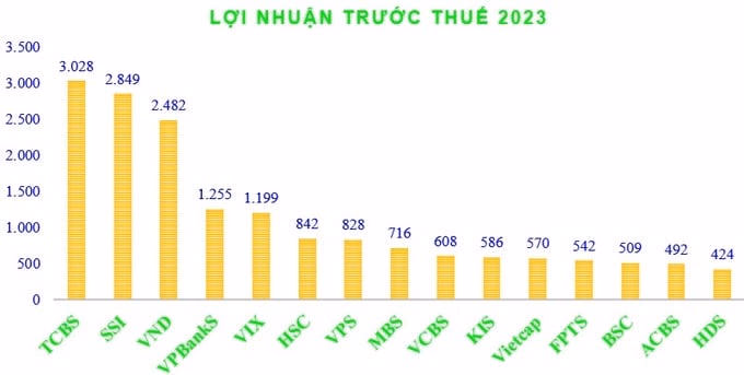 Có 5 công ty chứng khoán ghi nhận lợi nhuận trước thuế trong năm 2023 trên 1.000 tỷ đồng. Đó là TCBS, SSI, VNDS, VPBank và VIX.