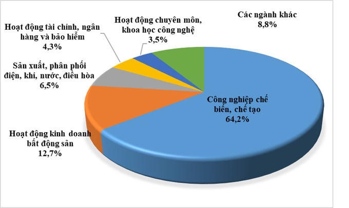 Theo số liệu từ Tổng Cục thống kê, Các nhà đầu tư nước ngoài đã đầu tư vào 18 ngành trong tổng số 21 ngành kinh tế quốc dân. Trong đó, ngành công nghiệp chế biến, chế tạo dẫn đầu với tổng vốn đầu tư đạt hơn 23,5 tỷ USD, chiếm 64,2% tổng vốn đầu tư đăng ký và tăng 39,9% so với năm trước. Ngành kinh doanh bất động sản đứng thứ 2 với tổng vốn đầu tư gần 4,67 tỷ USD, chiếm hơn 12,7% tổng vốn đầu tư đăng ký, tăng 4,8% so với năm trước.