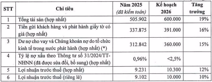 Năm nay, TPBank đặt kế hoạch kinh doanh với tổng tài sản đạt 600.000 tỷ đồng, tăng 19% (+94.098 tỷ đồng) so với năm 2025.