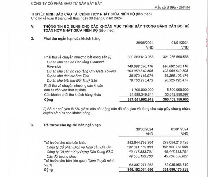 Đồng thời, khoản trả trước cho người bán trong ngắn hạn ghi nhận hơn 346 tỷ đồng, gồm: Phải trả trước cho Công ty Cổ phần Dịch vụ Nhịp cầu Địa ốc 193 tỷ đồng; Công ty Cổ phần Xây dựng Dân dụng E&C hơn 40 tỷ đồng...