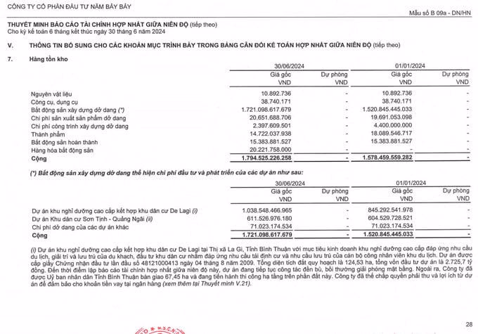 Mặt khác, Năm Bảy Bảy ghi nhận hàng tồn kho lên đến hơn 1.794 tỷ đồng, tăng 216 tỷ đồng, chủ yếu chôn vốn vào dự án khu nghỉ dưỡng cao cấp kết hợp khu dân cư De Lagi hơn 1.038 tỷ đồng, dự án Khu dân cư Sơn Tịnh - Quảng Ngãi hơn 611 tỷ đồng và chi phí dở dang của các dự án khác là hơn 71 tỷ đồng.