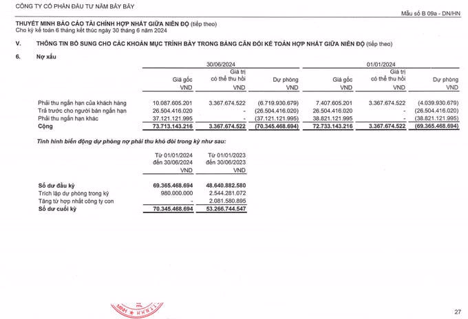 Theo đó, Năm Bảy Bảy đang có đến hơn 73 tỷ đồng tiền nợ xấu nhưng giá trị có thể thu hồi chỉ hơn 3,3 tỷ đồng. Trong đó các khoản phải thu ngắn hạn của khách hàng hơn 10 tỷ đồng, phải trả trước cho người bán ngắn hạn là hơn 26,5 tỷ đồng và phải thu ngắn hạn khác hơn 37 tỷ đồng.