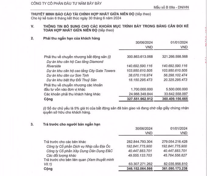 Tính đến ngày 30/6/2024, Năm Bảy Bảy ghi nhân có tổng tài sản đạt hơn 7.719 tỷ đồng, tăng hơn 809 tỷ đồng so với đầu năm. Trong đó, tài sản ngắn hạn đạt hơn 2.807 tỷ đồng, chiếm phần lớn là hàng tồn kho lên đến hơn 1.794 tỷ đồng, tăng hơn 216 tỷ đồng so với đầu năm. Cùng với các khoản phải thu ngắn hạn lên đến gần 925 tỷ đồng, trong đó phải thu về ngắn hạn từ dự án khu căn hộ cao tầng Diamond Riverside hơn140 tỷ đồng; Dự án khu căn hộ cao tầng City Gate Towers là gần 104 tỷ đồng; Dự án khu dân cư Sơn Tịnh hơn 38 tỷ đồng; Dự án khu biệt thự Đồi Thủy Sản hơn 18 tỷ đồng…