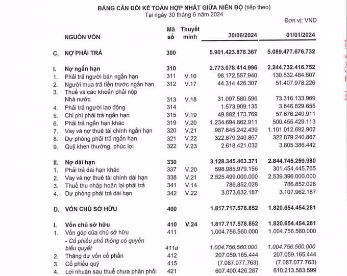 Cũng theo báo cáo tài chính hợp nhất giữa niên độ soát xét 6 tháng đầu năm 2024 cho thấy, nợ phải trả của Năm Bảy bảy tính đến ngày 30/6/2024 ghi nhận hơn 5.901 tỷ đồng, trong khi đó vốn chủ sở hữu chỉ đạt hơn 1.817 tỷ đồng, theo đó hệ số nợ trên vốn chủ sở hữu hơn 3,2 lần.