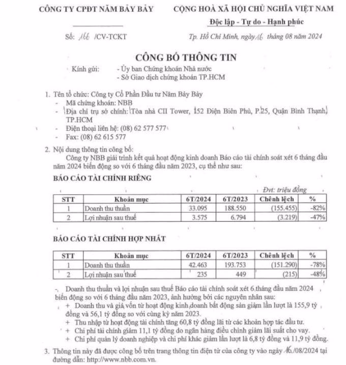Theo giải trình kết quả hoạt động kinh doanh tại báo cáo tài chính hợp nhất giữa niên độ soát xét 6 tháng đầu năm 2024 biến động so với 6 tháng đầu năm 2023 của Công ty Cổ phần Năm Bảy Bảy (gọi tắt là: Năm Bảy Bảy; mã chứng khoán: NBB) cho thấy, doanh thu thuần chỉ đạt gần 42,5 tỷ đồng, so với cùng kỳ năm 2023 âm 78%. Tương tự, lợi nhuận sau thuế so với cùng kỳ năm 2023 âm đến 47% khi chỉ đạt 235 triệu đồng.