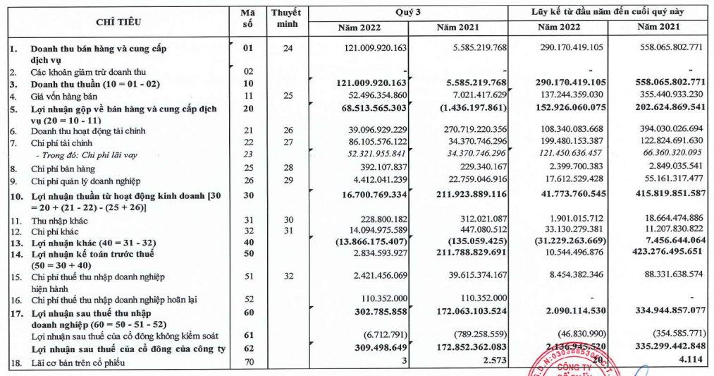 Về kết quả kinh doanh, trong quý III/2022, doanh thu của NBB tăng đột biến tới 20 lần so với cùng kỳ năm trước, đạt 121 tỷ đồng. Nguồn thu chủ yếu đến từ doanh thu kinh doanh bất động sản (114 tỷ đồng - cùng kỳ không ghi nhận khoản này).