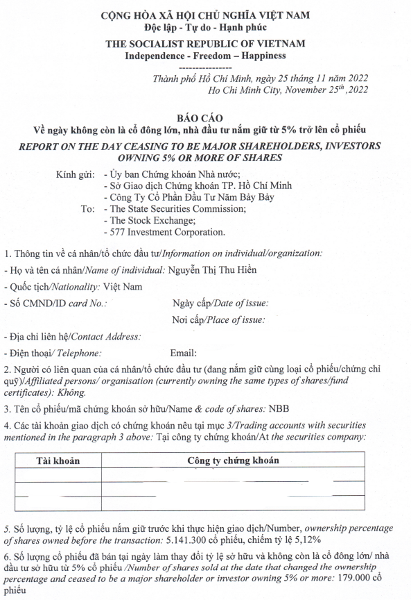 Theo đó, bà Nguyễn Thị Thu Hiền vừa bán ra 179.000 cổ phiếu NBB để giảm sở hữu từ 5,12% về còn 4,94% vốn điều lệ, giao dịch được thực hiện ngày 24/11. Như vậy, sau giao dịch, bà Hiền không còn là cổ đông lớn của Năm Bảy Bảy.