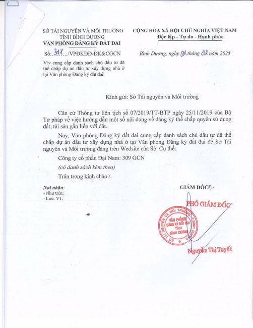 Trong văn bản có ghi rõ: “Căn cứ thông tư liên tịch số 07/2019/TT-BTP ngày 25/11/2019 của Bộ Tư pháp về việc hướng dẫn một số nội dung về đăng ký thế chấp quyền sử dụng đất, tài sản gắn liền với đất. Nay văn phòng Đăng ký đất đai cũng cấp danh sách chủ đầu tư đã thế chấp dự án nhà ở tại Văn phòng đăng ký đất đai cho Sở Tài nguyên và Môi trường. Cụ thể, Công ty Cổ phần Đại Nam: 309 GCN”.