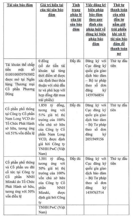 Đáng chú ý, tài sản đảm bảo cho các trái phiếu này là tài khoản thế chấp tiền mặt tại Ngân hàng TMCP Phương Đông hiện có giá trị 0 đồng (số dư sẽ được xác định theo thỏa thuận với nhà đầu tư và phù hợp với hợp đồng đặt mua trái phiếu); cổ phần tại Công ty Nam Long VCD do Nam Long sở hữu với tỷ lệ 51% vốn điệu lệ, có giá trị 1.850 tỷ đồng; cổ phần phổ thông và ưu đãi cổ tức tại Công ty NHH Mizuki do Nam Long sở hữu, tương ứng 50% vốn điều lệ và có giá trị 1.500 tỷ đồng.