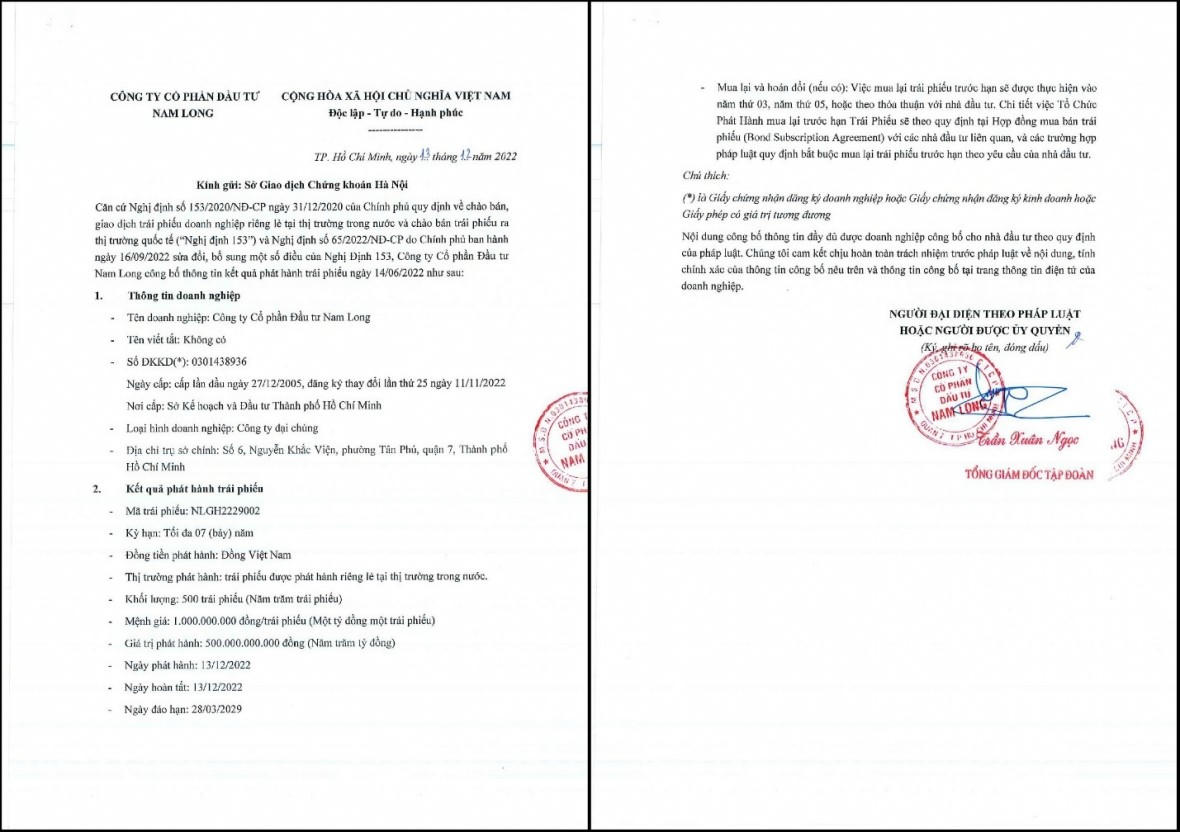 Cụ thể, theo thông tin được công bố, lô trái phiếu có mã NLGH2229002 được phát hành theo hình thức riêng lẻ. Lô trái phiếu có kỳ hạn 7 năm (đáo hạn vào ngày 28/3/2029) được phát hành vào ngày 13/12/2022, được hoàn tất vào cùng ngày và lãi suất được xác định bằng tổng lãi suất cơ bản cố định cộng biên độ 3,5%/năm. Trong đó, lãi cơ bản là mức lãi được thỏa thuận, xác định tại thời điểm giải ngân.