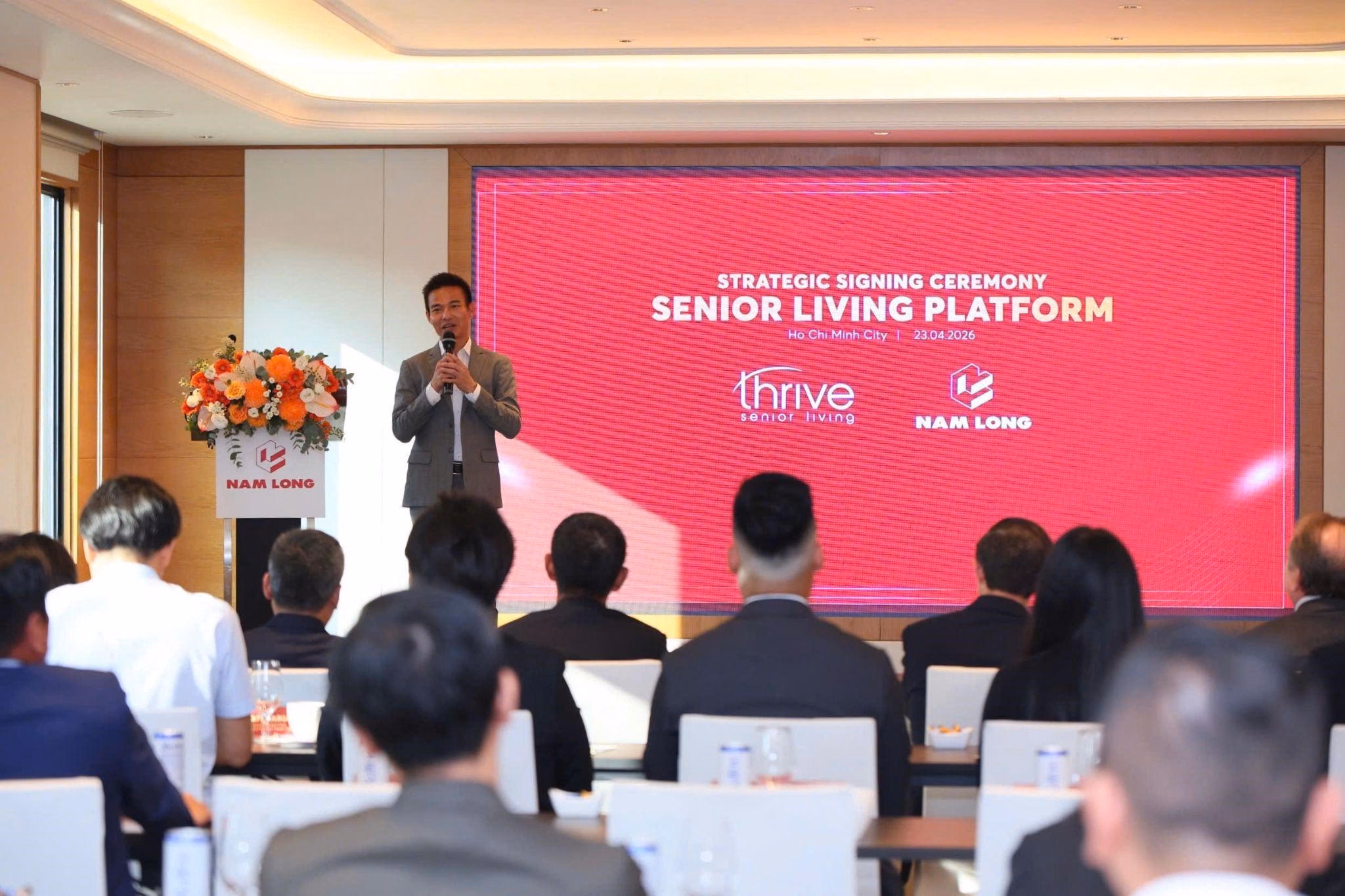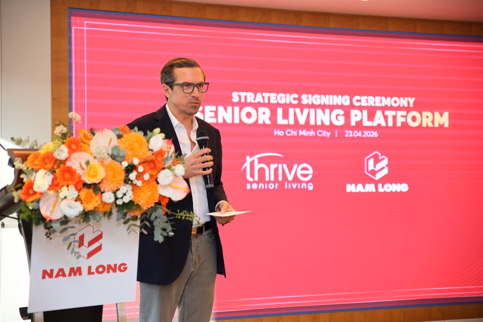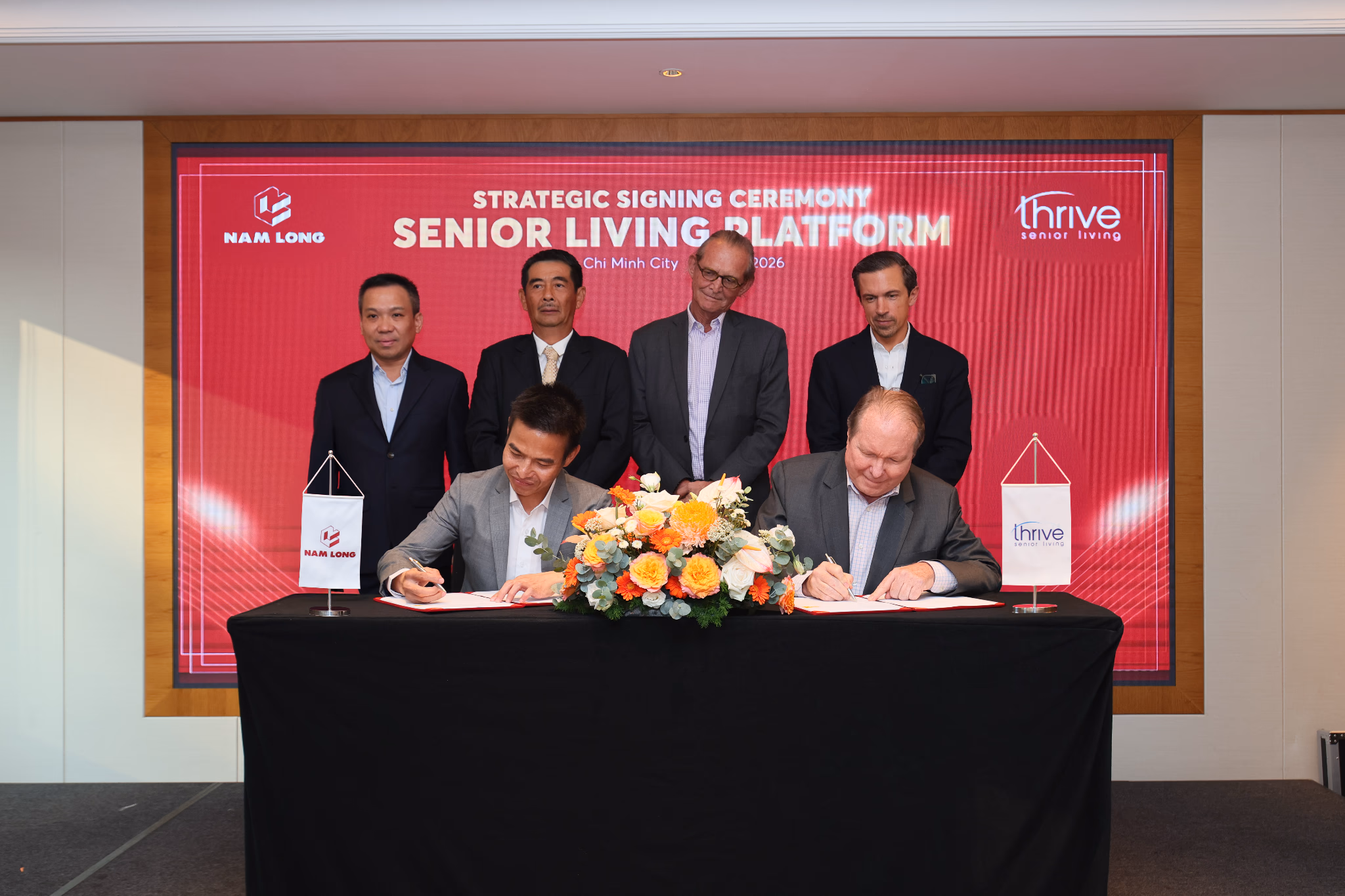 TP.HCM, ngày 23 tháng 4 năm 2026 - Nam Long Commercial Property, thành viên của Tập đoàn Nam Long (HOSE: NLG), chính thức ký kết hợp tác chiến lược với Thrive - công ty có 25 năm kinh nghiệm toàn cầu về nhà ở và dịch vụ chăm sóc cho người cao tuổi. Hợp tác chiến lược này nhằm triển khai mô hình cộng đồng nhà ở cao cấp cho người cao tuổi (Senior Living) tại Việt Nam.
