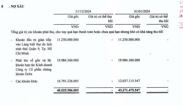 Tại ngày 31/12/2024, Nam Tân Uyên đang có các khoản nợ xấu là tổng giá trị các khoản phải thu, cho vay quá hạn thanh toán hoặc chưa quá hạn nhưng khó có khả năng thu hồi lên tới hơn 48 tỷ đồng. Trong đó, 11,25 tỷ đồng là khoản đầu tư gián tiếp vào Làng biệt thự du lịch sinh thái nằm tại Quận 9, TP HCM và hơn 19,98 tỷ đồng là khoản hợp tác Kinh doanh CTCP Chứng khoán Delta, số còn lại nằm rải rác ở các khoản phải thu khác.
