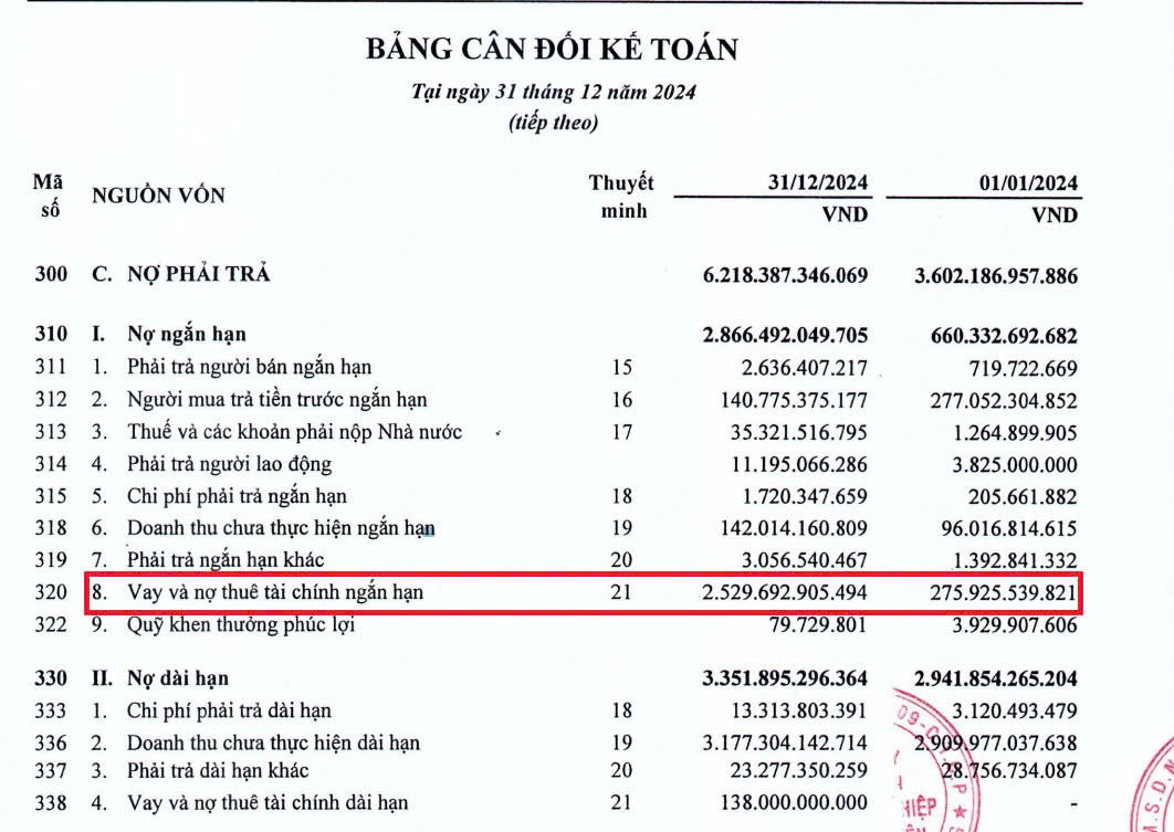 Để đầu tư cho dự án KCN Nam Tân Uyên mở rộng, doanh nghiệp đã gia tăng vay nợ. Theo đó, tại bảng cân đối kế toán cho thấy, nợ phải trả của doanh nghiệp ghi nhận hơn 6.218 tỷ đồng, tăng 73% so đầu năm. Trong đó, nợ vay tài chính ngắn hạn tăng mạnh từ 275,9 tỷ đồng đầu năm lên gần 2.529,6 tỷ đồng.