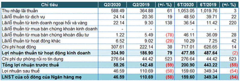 Tuy nhiên, lợi nhuận sụt giảm là do tăng mạnh chi phí dự phòng rủi ro. Chi phí này trong quí II là 277 tỉ đồng, gấp 6,2 lần so với quí II/2019. Do đó, mặc dù trong kì các mảng kinh doanh chính của ngân hàng đều có lãi thuần tăng mạnh, lợi nhuận thuần từ hoạt động kinh doanh tăng 79,1% đạt 335 tỉ đồng nhưng lợi nhuận vẫn tăng trưởng âm.