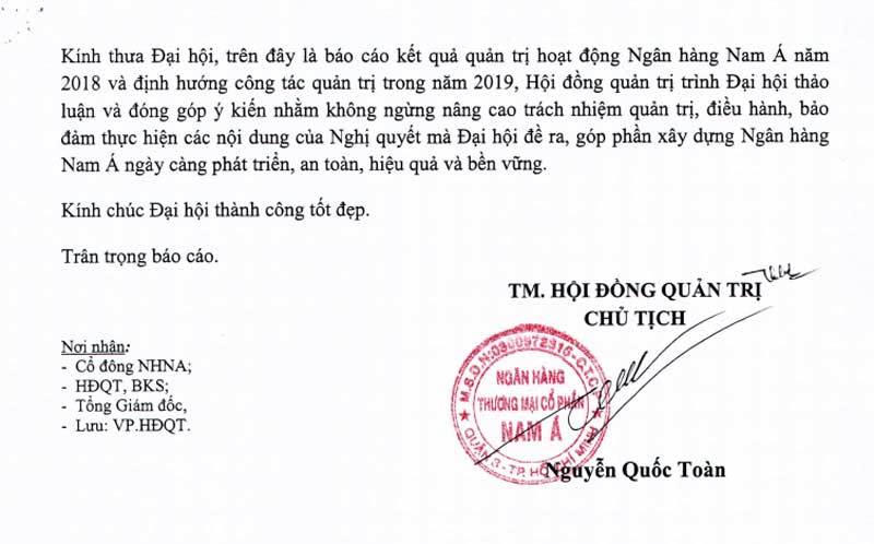 Tại ĐHĐCĐ ngày 23/3/2019 vừa qua, trong đoàn chủ tọa không có mặt của chủ tịch Nguyễn Quốc Toàn (con trai lớn nhà cố lão bà doanh nhân Tư Hường - Trần Thị Hường). Em trai ông Toàn là ông Nguyễn Quốc Mỹ cũng không có mặt trong đoàn chủ tọa. Thay vào đó, ông Phan Đình Tân, phó chủ tịch NamABank là chủ tọa đoàn.