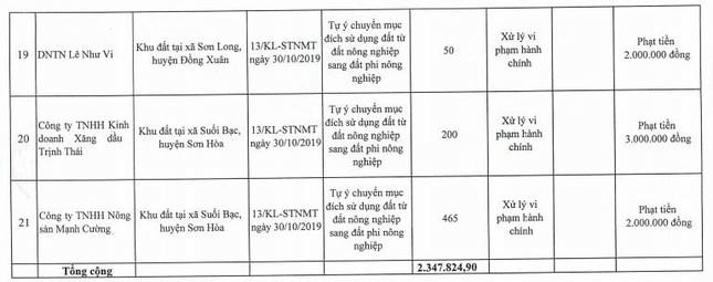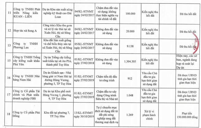 Trong số các dự án, công trình vi phạm về đất đai nói trên, nhiều dự án có diện tích vi phạm lớn như: dự án trồng cây kiểng xuất khẩu tại TP Tuy Hòa do Công ty TNHH Trồng cây kiểng xuất khẩu Phú Yên làm chủ đầu tư với diện tích hơn 1,3 triệu m2; Công ty TNHH Asia Hawai Ventures với hơn 495.500m2; Công ty TNHH Thanh Tùng 100.000 m2; Công ty TNHH Phát triển Nông kiến Kuan-Liên 100.000 m2; dự án khu resort Thuận Thảo của Công ty CP Thuận Thảo với hơn 79.400 m2…
