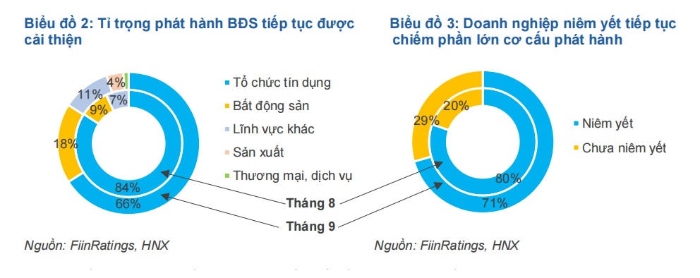 Theo FiinRatings, thị trường trái phiếu 9 tháng qua ghi nhận giá trị phát hành đạt 246,32 nghìn tỷ VNĐ, tương đương 35,87% giá trị năm 2021, trong đó 58% giá trị đến từ tổ chức tín dụng và 21% đến từ ngành bất động sản. Về loại hình phát hành, tỷ lệ phát hành ra công chúng chỉ chiếm 3,87%.