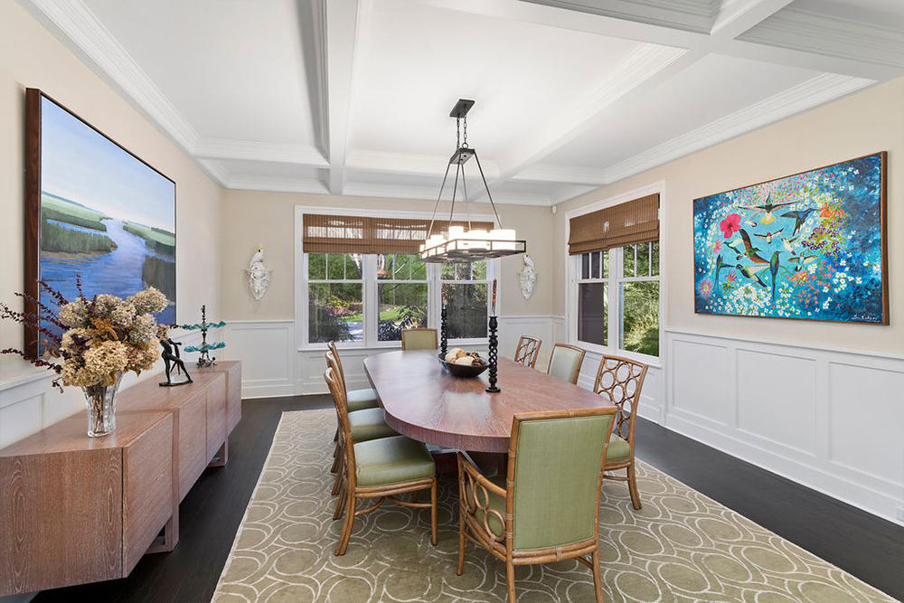 Phòng ăn lớn sang trọng được trang trí bằng những bức tranh nghệ thuật.