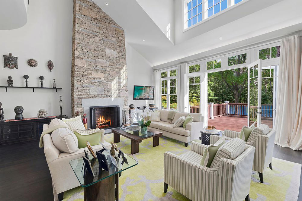 Một tiền sảnh lớn dẫn đến một phòng khách với lò sưởi bằng đá cao chót vót và một phòng ăn riêng.