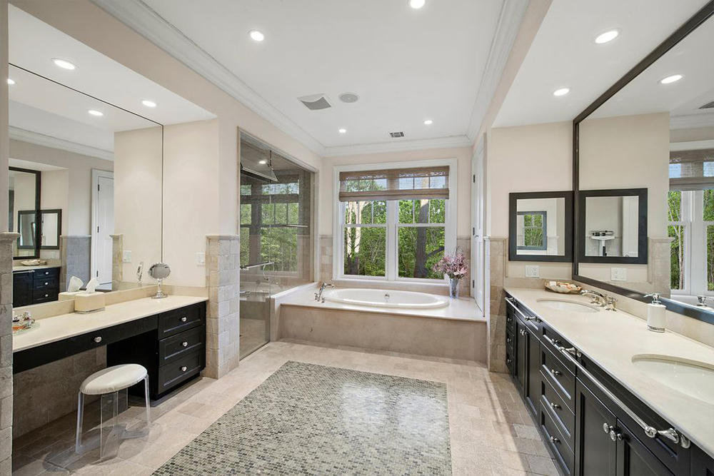 Phòng tắm chính rộng rãi, được lát gạch men màu be, có đầy đủ bồn tắm, vòi sen, và cả bàn trang điểm chuyên dụng.