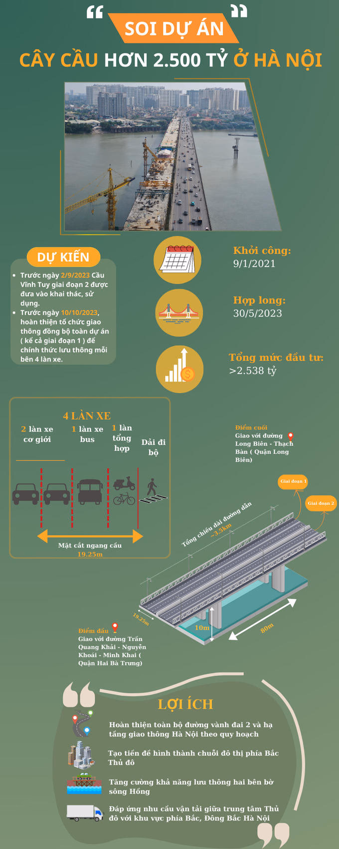 Cầu Vĩnh Tuy 2 dài 3,5km bắc qua sông Hồng, với tổng mức đầu tư hơn 2.500 tỷ đồng, là một trong những công trình trọng điểm của TP Hà Nội.