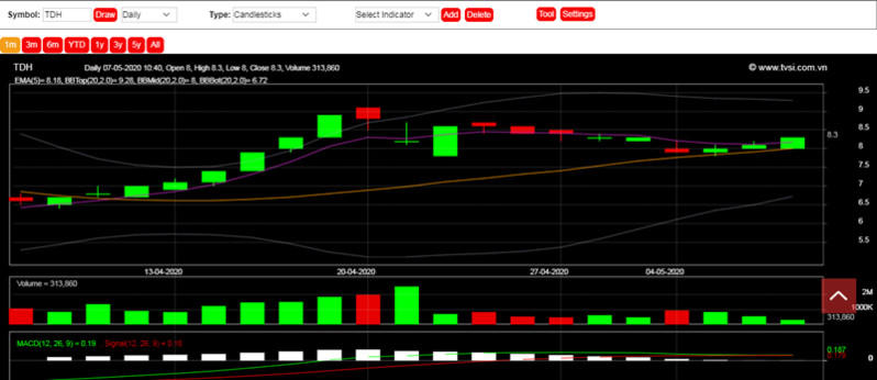 Giá cổ phiếu TDH tăng mạnh từ cuối tháng 3, tuy nhiên sau khi đạt mức 8,880 đồng/cp vào ngày 17/04, giá cổ phiếu TDH hiện đã chững lại.
