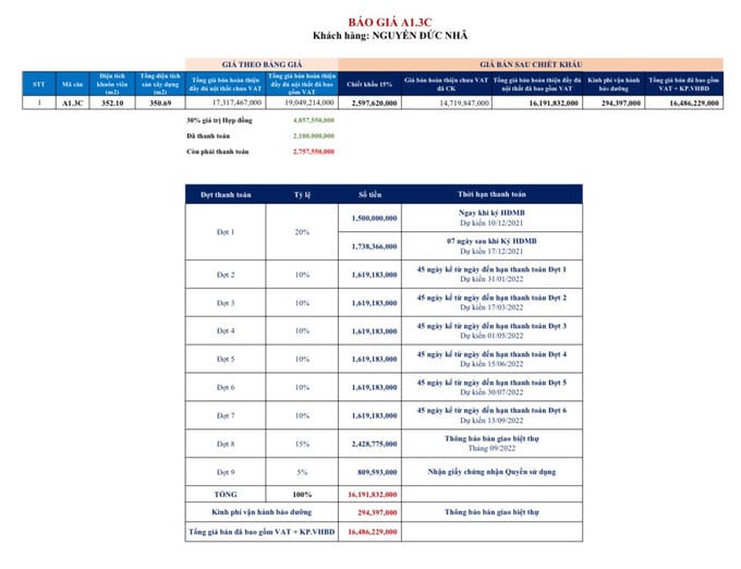 Do tin tưởng ông Minh, vào tháng 11/2021 ông Nhã đã tiến hành mua biệt thự A1.3C thuộc dự án Khu du lịch Hải Minh với giá là 16.191.832.000 đồng.