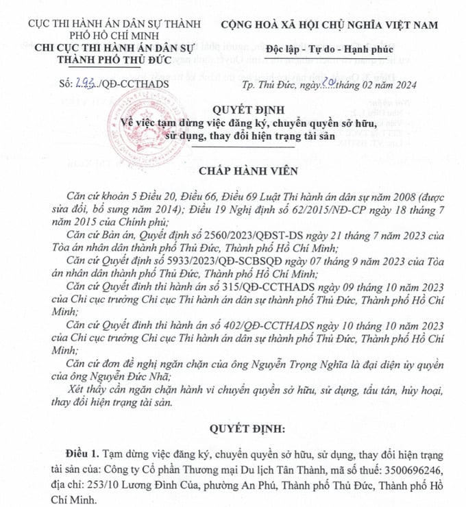 Cục thi hành án dân sự Tp.Thủ Đức vừa ban hành Quyết định số 293/QĐ-CCTHADS về việc tạm dừng việc đăng ký, chuyển quyền sở hữu, sử dụng, thay đổi hiện trạng tài sản của: Công ty Cổ phần Thương mại Du lịch Tân Thành (gọi tắt là Công ty Tân Thành), mã số thuế: 3500696246, địa chỉ: 253/10 Lương Định Của, phường An Phú, Tp.Thủ Đức, Tp.HCM.