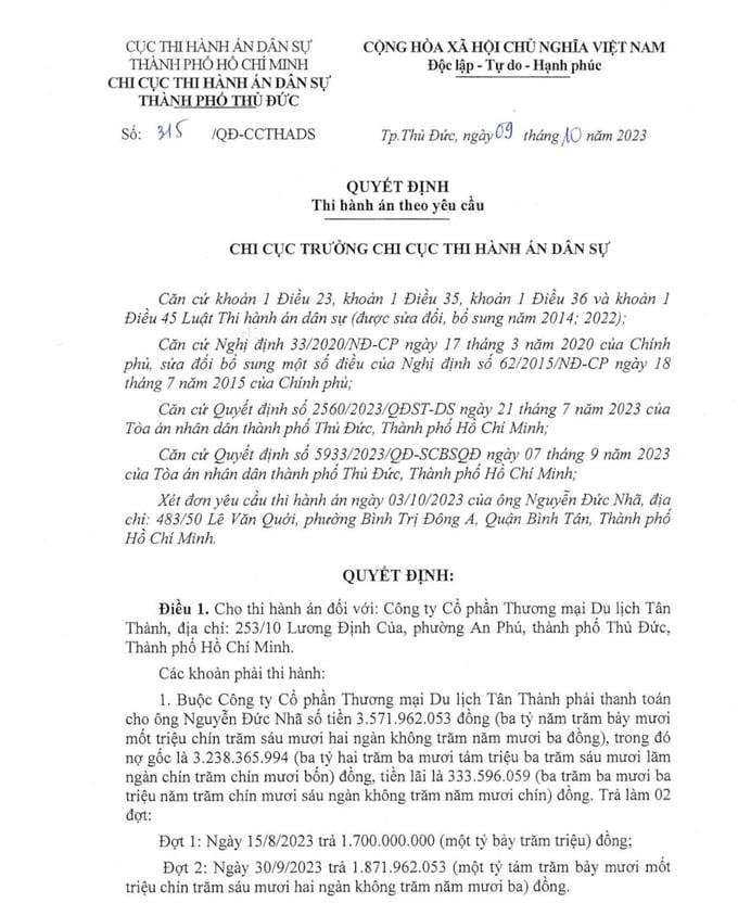 Trước đó, ngày 09/10/2023 Cục thi hành án dân sự Tp.Thủ Đức đã ra Quyết định thi hành án theo yêu cầu buộc Công ty Tân Thành phải thanh toán cho ông Nguyễn Đức Nhã số tiền 3.571.926.053 đồng