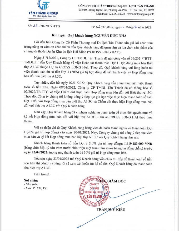 Đồng thời, ngày 21/4/2022, Công ty Tân Thành tiếp tục gửi văn bản số 28/2022/CV-TTG với nội dung yêu cầu ông nhã thanh toán số tiền đợt 2 là 1.619.183.000 đồng trước ngày 23/4/2022. Nếu sau ngày 23/4/2022 chưa thanh toán thì Công ty hoàn lại số tiền mà ông Nhã đã thanh toán