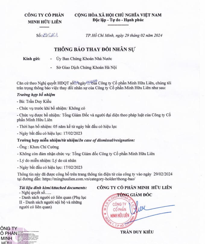 Được biết, bà Trần Duy Kiều ngoài đang điều hành Công ty Cổ phần Thương mại Du lịch Tân Thành, bà Kiều cũng đang là người đại diện của nhiều công ty như: Công ty TNHH Thương mại – Sản xuất Tân Nhã Vinh; Công ty Cổ phần Tập đoàn Kings Holdings; Nhà máy Chi nhánh Công ty Cổ phần Minh Hữu Liên – Long An. Đặc biệt, vừa qua ngày 29/2/2024, bà Trần Duy Kiều được bổ nhiệm làm Tổng Giám đốc kiêm đại diện pháp luật Công ty Cổ phần Minh Hữu Liên.