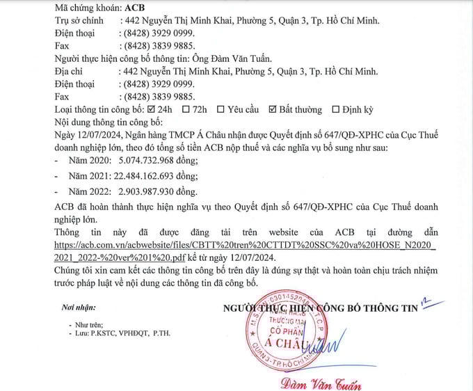Ngân hàng TMCP Á Châu (viết tắt là Ngân hàng ACB; mã chứng khoán: ACB) vừa có văn bản số 3331/CV-KSTC.24 công bố thông tin bất thường về việc Ngân hàng ACB nhận được Quyết định số 647/QĐ-XPHC xử phạt hành hành chính của Cục Thuế doanh nghiệp lớn vào ngày 12/7. Theo đó, ACB đã phải nộp thuế và các nghĩa vụ bổ sung với tổng số tiền hơn 30 tỷ đồng.