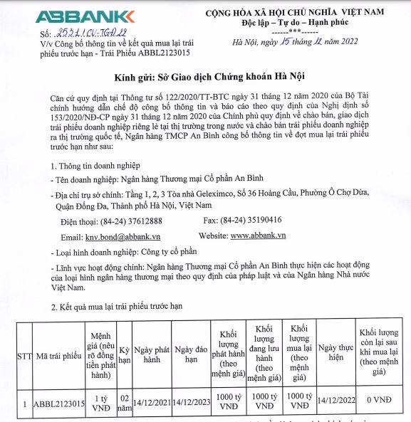 Mới đây, Sở Giao dịch Chứng khoán Hà Nội (HNX) thông báo Ngân hàng TMCP An Bình (ABBank, UPCoM: ABB) vừa hoàn tất mua lại toàn bộ lô trái phiếu mã ABBL2123015 có giá trị 1.000 tỷ đồng được phát hành ngày 14/12/2021, đáo hạn ngày 14/12/2023.