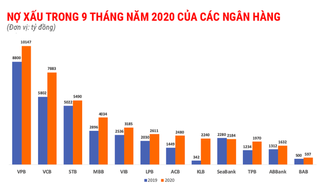 Một thống kê tại 16 ngân hàng đã công bố báo cáo tài chính hợp nhất quý III/2020 cho thấy, nợ xấu nội bảng cuối tháng 9 ở mức hơn 49.600 tỷ đồng, tăng gần 12.000 tỷ so với hồi đầu năm, tương đương tăng 31%. Trong khi đó, 14/16 ngân hàng đều có nợ xấu tăng, với nhiều nhà băng tăng hơn 50% trong 9 tháng. Cụ thể tại Vietcombank, nợ xấu tăng 36% so với đầu năm, đạt gần 7.885 tỷ đồng. Quy mô nợ nhóm 3 (nợ dưới tiêu chuẩn) tăng hơn bốn lần lên 2.923 tỷ đồng; nợ nhóm 4 (nợ nghi ngờ) tăng gấp ba lần. Tỷ lệ nợ xấu trên tổng dư nợ tăng từ 0,79% lên 1,01%.