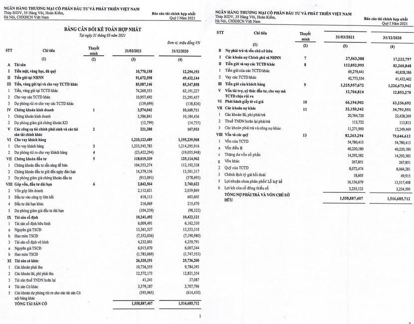 Ngân hàng TMCP Đầu tư và Phát triển Việt nam vừa công bố báo cáo tài chính hợp nhất quý 1/2021 với lãi trước thuế tăng 87% so với cùng kỳ, đạt hơn 3.396 tỷ đồng nhờ nguồn thu ngoài lãi tăng mạnh.