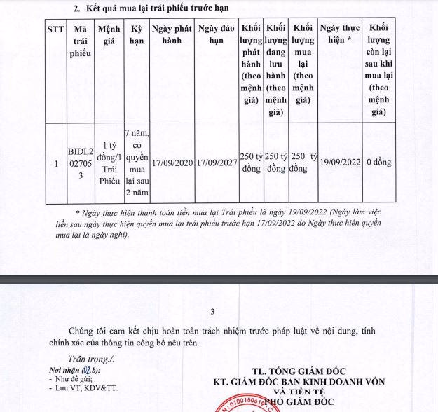 Tháng 7/2022, nhà băng này cũng đã mua lại toàn bộ 3.260 tỷ đồng trái phiếu từ 2 lô trái phiếu mã BID2-RL-2036 kỳ hạn 7 năm, phát hành năm 2020 có tổng giá trị 260 tỷ đồng và mã BIDL2127014 kỳ hạn 6 năm, phát hành năm 2021 với tổng giá trị 3.000 tỷ đồng.