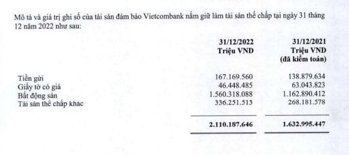 Cụ thể, theo báo cáo tài chính hợp nhất quý 4/2022, lượng tài sản thế chấp tại Vietcombank trong năm 2022 đã tăng thêm hơn 477.000 tỷ đồng (tăng 29,2%), lên trên 2,11 triệu tỷ đồng. Đây là lần đầu tiên quy mô tài sản thế chấp tại Vietcombank vượt mốc 2 triệu tỷ.