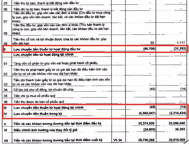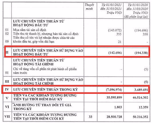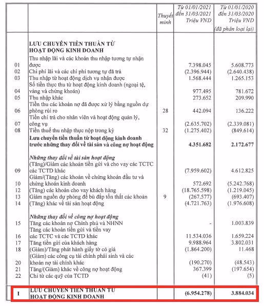 Trong khi đó, lưu chuyển tiền thuần trong kỳ tại Techcombank cũng đang âm gần 7.097 tỷ đồng trong khi cùng kỳ 2020 đạt hơn 3.689 tỷ đồng. Trong đó, lưu chuyển tiền thuần từ hoạt động kinh doanh bị âm hơn 6.954 tỷ (cùng kỳ 2020 dương 3.884 tỷ đồng) chủ yếu do các khoản cho vay khách hàng tăng, lên hơn 18.765 tỷ trong khi tiền gửi của khách hàng chảy vào chỉ tăng lên gần 9.989 tỷ đồng. Đồng thời, Techcombank còn thanh toán khoản công nợ hoạt động hơn 367 tỷ đồng.