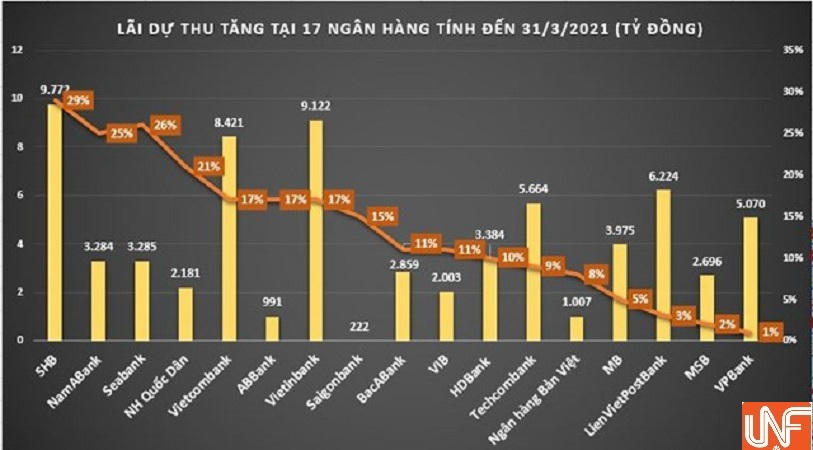 Có thể nhận thấy rằng hai ngân hàng có lãi dự thu lớn đầu bảng hiện tại và SCB và Sacombank đều là hai ngân hàng đang trong quá trình tái cơ cấu sau quá trình sáp nhập với những ngân hàng "yếu kém" khác.