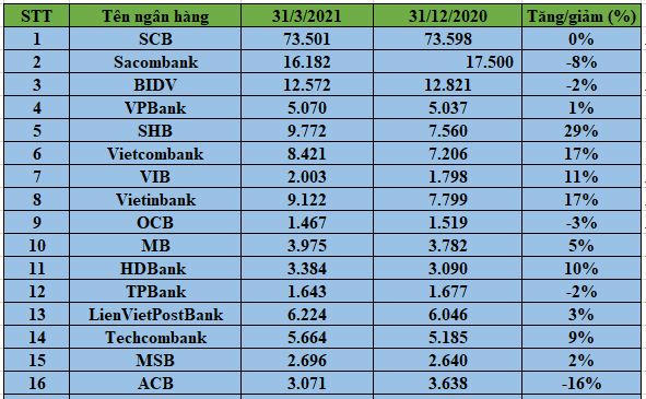 Tại SHB, kết thúc quý 1/2021, lãi trước thuế và sau thuế tại SHB gấp đôi cùng kỳ năm trước, tương ứng đạt hơn 1.664 tỷ đồng và hơn 1.330 tỷ đồng. Nếu so với kế hoạch tăng trưởng lợi nhuận trước thuế 70%, tương đương 5.800 tỷ đồng cho cả năm 2021, SHB đã thực hiện được 29% sau quý đầu năm.