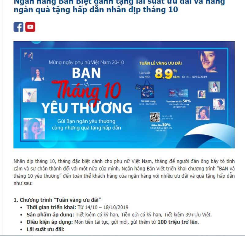 Ngân hàng TMCP Bản Việt (VietCapitalBank) vừa thông báo về việc tăng lãi suất tiền gửi cho tất cả khách hàng giao dịch từ ngày 14 đến 18/10.