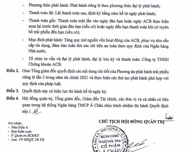 Về mục đích sử dụng vốn, ACB cho biết đợt huy động trái phiếu này nhằm tăng quy mô nguồn vốn hoạt động của ngân hàng, phục vụ nhu cầu cấp tín dụng và đảm bảo tuân thủ các chỉ tiêu an toàn.