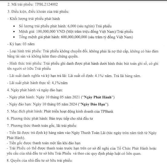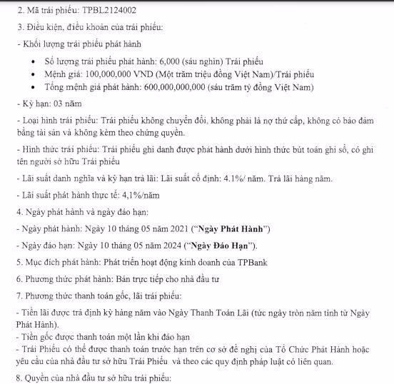 Tương tự, ngày 10/05, ngân hàng TPBank cũng đã phát hành 600 tỷ đồng trái phiếu trực tiếp cho công ty chứng khoán trong nước. Trái phiếu có kỳ hạn 3 năm, trả lãi hàng năm theo lãi suất cố định 4,1%/năm. Ngày phát hành là 10/05/2021 và ngày đáo hạn là 10/05/2024. Đây là loại trái phiếu không chuyển đổi, không phải nợ thứ cấp, không có bảo đảm bằng tài sản và không kèm chứng quyền.
