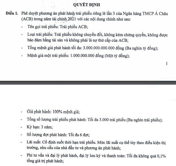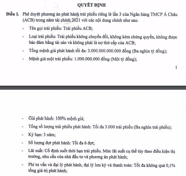 Mới đây, ngân hàng ACB có kế hoạch phát hành tối đa 3.000 tỷ đồng trái phiếu, kỳ hạn ba năm với mệnh giá 1 tỷ đồng/trái phiếu, tương ứng với tổng mệnh giá phát hành tối đa là 3.000 tỷ đồng. Lần phát hành này được chia ra tối đa làm 6 đợt.