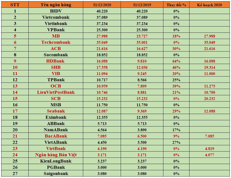 Ngược lại, 6 tháng cuối năm 2020 các ngân hàng dồn dập kế hoạch tăng vốn điều lệ. Kết quả, hết năm 2020 có 13/27 ngân hàng đã tăng vốn điều lệ so với đầu năm.