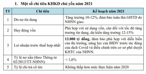 BIDV dự kiến trình cổ đông thông qua kế hoạch kinh doanh năm 2021 với lợi nhuận trước thuế hợp nhất đạt 13.000 tỷ đồng, tăng hơn 44% so với mức thực hiện của năm 2020. Nợ xấu duy trì dưới mức 1,6%. Dư nợ tín dụng kế hoạch tăng trưởng 10-12%.