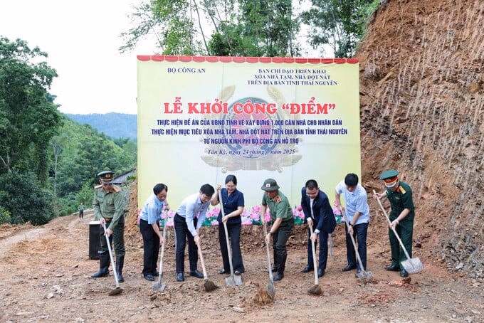 Lãnh đạo Bộ Công an, tỉnh Thái Nguyên và LPBank thực hiện nghi thức động thổ xây dựng những căn nhà đầu tiên cho người dân trên địa bàn