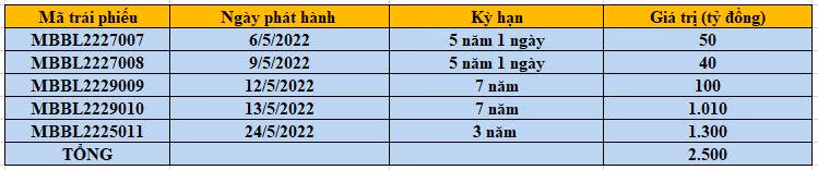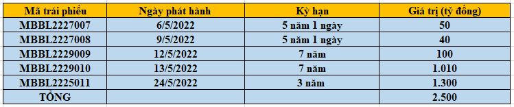 Ngoài ra, MB cho biết đã phát hành thành công 190 tỷ đồng trái phiếu trong ba đợt 6/5/2022, 9/5/2022 và 12/5/2022 với kỳ hạn 5 năm 1 ngày và kỳ hạn 7 năm.