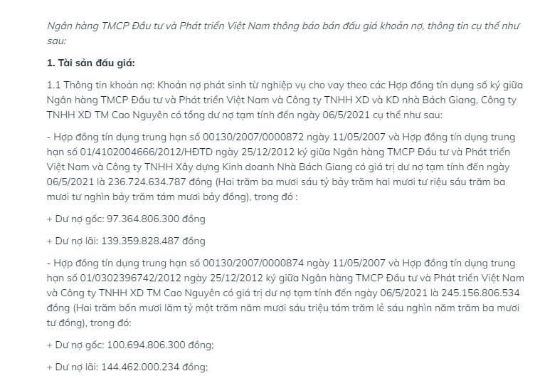 Trước đó, BIDV cũng ra thông báo rao bán 2 khoản nợ của Công ty TNHH Xây dựng và Kinh doanh nhà Bách Giang và Công ty TNHH Xây dựng Thương mại Cao Nguyên với giá khởi điểm 312,2 tỷ.